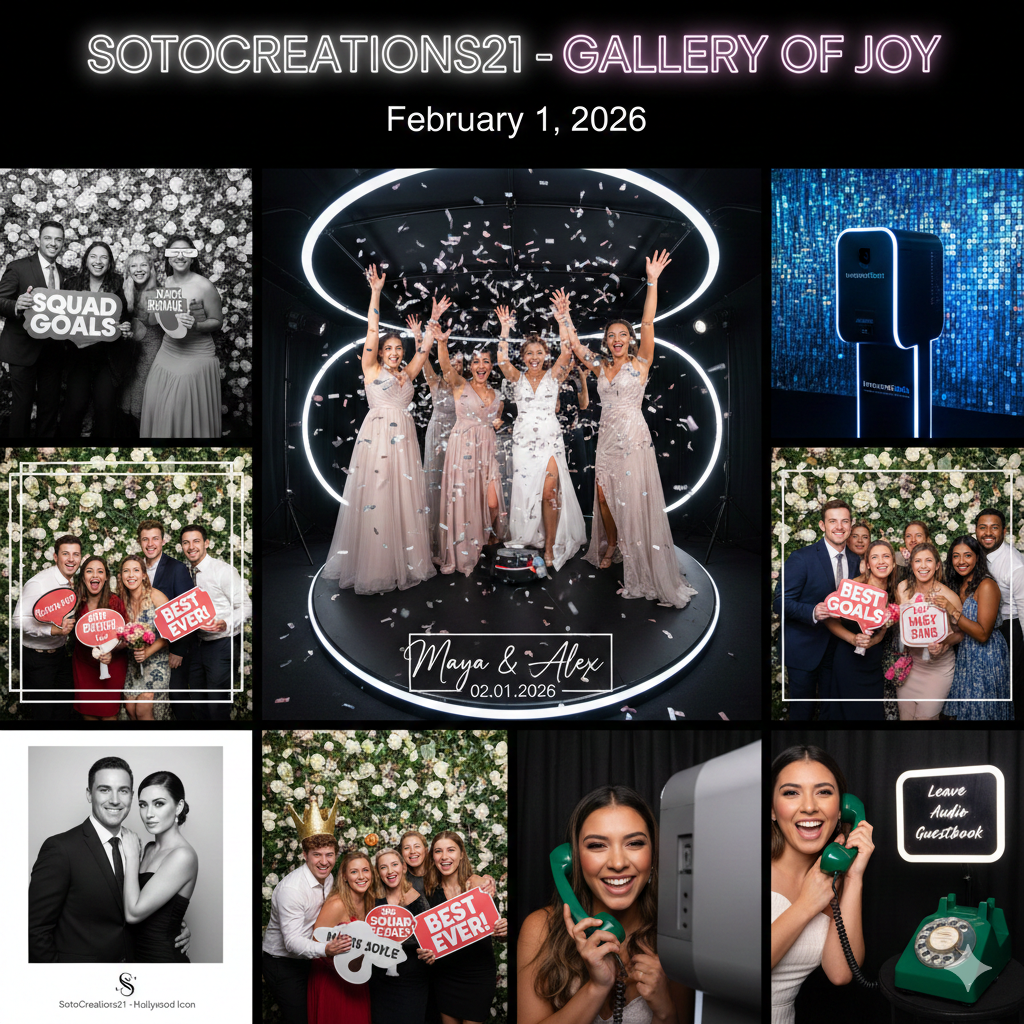 At SotoCreations21, we offer a variety of interactive photo and video experiences, tailored to your event's unique vibe. Whether you seek nostalgic keepsakes or high-energy social media moments, we have the perfect package to elevate your celebration.